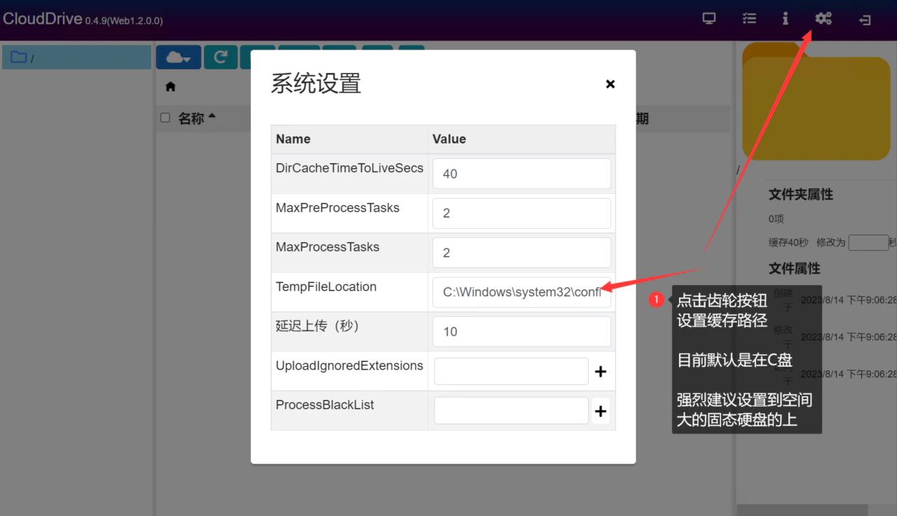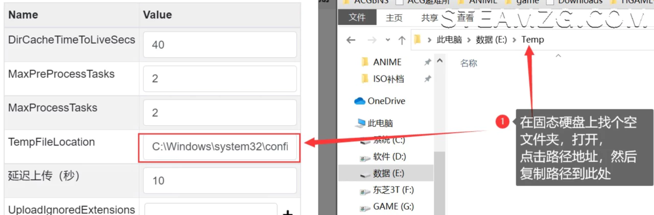 在TempFileLocation所在行,输入你要设置的缓存路径(不会设的看下图)