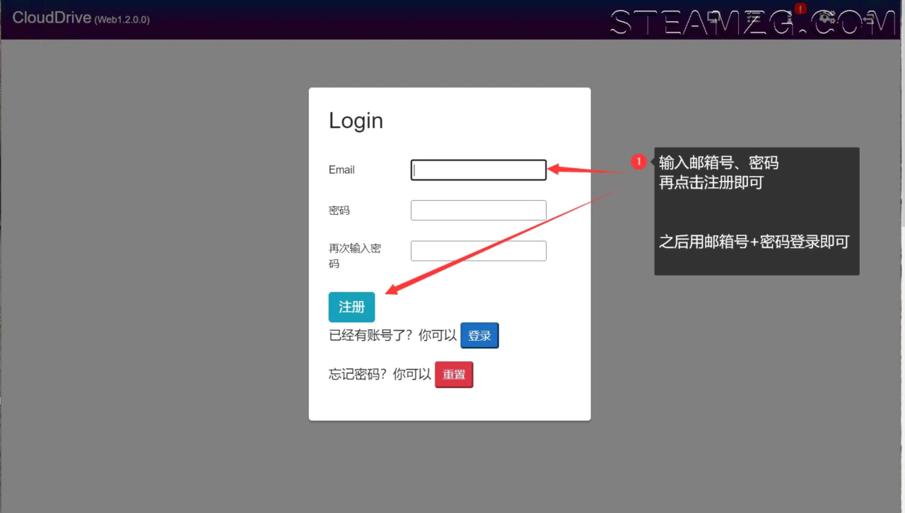 1、输入邮箱号,以及设置一个cloudDrive的登陆密码(不要填写邮箱密码)