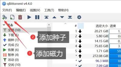 点击左上角两个图标,分别添加磁力链接或种子。