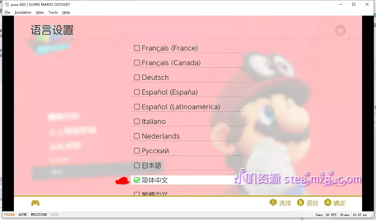 9、成功进入游戏,如果游戏有自带中文的话,会默认让你选择语言,比如这款马里奥 奥德赛,自带多语言,网上流传是N卡优化比较好,但是站长并没有N卡,所以无从对比,大家自行测试即可
